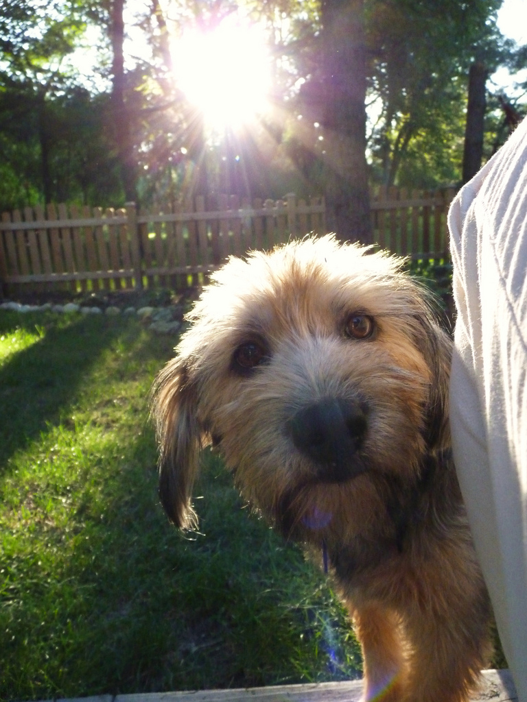 Hunden på bildet over føler seg ikke trygg på at han får beholde det han gnager på, og ser vaktsomt opp på den som nærmer seg.